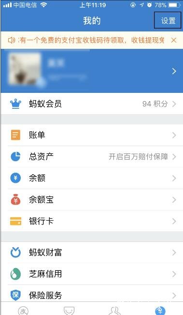 2、点击选项“我的”之后,页面就进入到新的页面,在这个页面右上角有个设置选项,点击该选项。