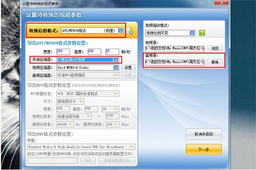 3、接着将会出现设置转换视频参数的窗口界面,在上方选择转换完成的格式,并在下方的开启压缩器中选择“只要压缩视频”选项,这样就可以只压缩视频,不压缩音频了;消音的最终目的是将另外的音频文件替换到当前已消音的视频中,如果你想要在此软件中直接消音并替换另外的音乐,则直接选择音频源即可,点击“下一步”选项,如下图所示: