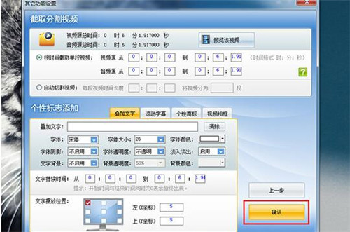 3、紧接着将会进入到“其他功能设置”的界面,其中的“截取分割视频”栏目就是今天所说的主角,大家可以在上方看到视频源的总时间,也就是视频的总长度,大家可以在下方选择“截取”或“切割”功能其中的一个,如果你想要截取视频,而并没有其他类型的音频源进行选择,则保持视频源与音频源时间段的一致性,否则将出现声音、视频不同步的情况发生,除非你有意错开它们;选择合适的长度后,进行视频的预览,点击“确定”即可完成截取分割视频的设置,如下图所示: