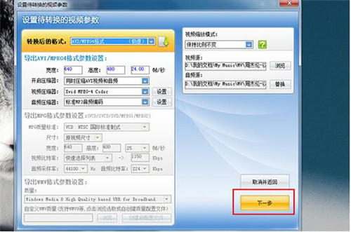 2、成功导入视频文件后将会出现设置视频参数的界面,选择合适的视频转换格式,最好是和原视频文件格式保持一致,之后点击“下一步”选项,如下图所示: