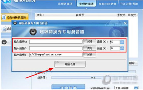 2、进入到超级转换秀专用混音器的界面后,用户就可以在“输入音频1”与“输入音频2”中浏览插入音频文件了,成功加入音乐后就可以在右方调整每个音乐的音量,最后选择“输出音频”点击“开始混音”选项即可在一段音乐中添加另一段音乐;由于此功能需要正式用户才可以使用,所以需要用户事先输入注册码进行软件的注册才可以正常运行此功能,如下图所示: