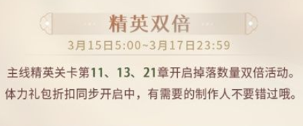 在3月15日5:00-3月17日23:59期间主线精英关卡第11、13、21章开启掉落数量双倍活动,体力礼包折扣也将开启。