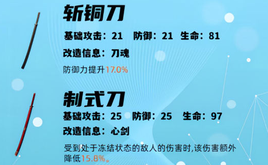如果队伍搭配可以使敌人一直处于冻结状态,制式刀则优于斩铜刀。反之队伍搭配对冻结状态的优先级不高的话,则斩铜刀优于制式刀