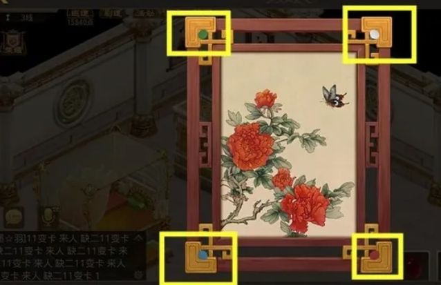 3、在房间内左上角墙壁上找到这幅画,看到四个角的颜色。