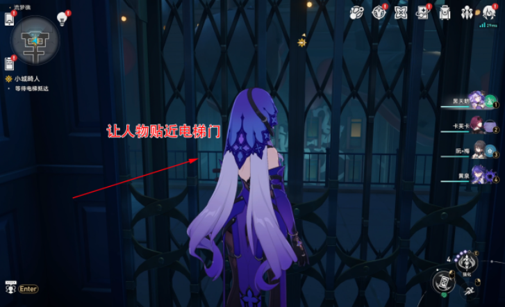 首先来到“流梦礁”,传送至一层锚点“窄巷”,一直往前走,进入下图点位中的电梯
