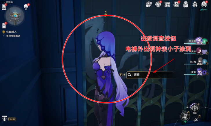 随后在电梯上行约15秒时,会出现钟表小子涂鸦,并出现“调查”按钮