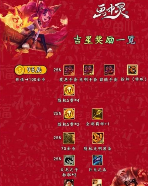 天龙转×3+龙牙+2星盲僧+2星霞(25%)、光明偷偷+偷偷+奥恩偷偷+辅助偷偷+金拆解器+5费卡×4(25%)、所有羁绊+1+5费卡×2(25%)、光明装+70金币(25%)