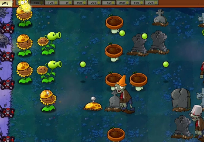 4、在第二波僵尸出现后阳光就充足了,需要摆放两列豌豆向日葵,在小盆菇的位置上放一列双发仙人掌和火炬坚果用来输出。