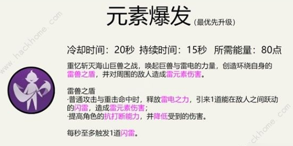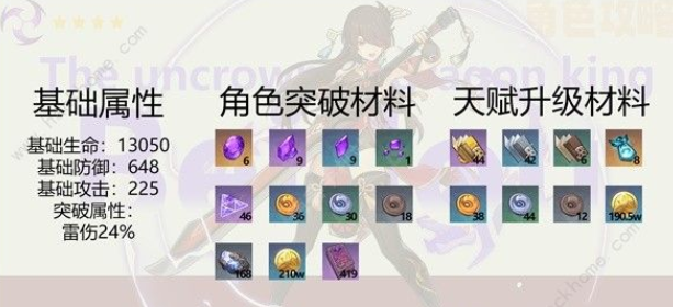 天赋加点1-9-9(打主c可以适当升级普攻),其中雷属性突破素材由40级以上无相之雷、雷音权现、雷属性古岩龙蜥、深海龙蜥之群、掣电树掉落;46个雷光棱镜由无相之雷掉落;