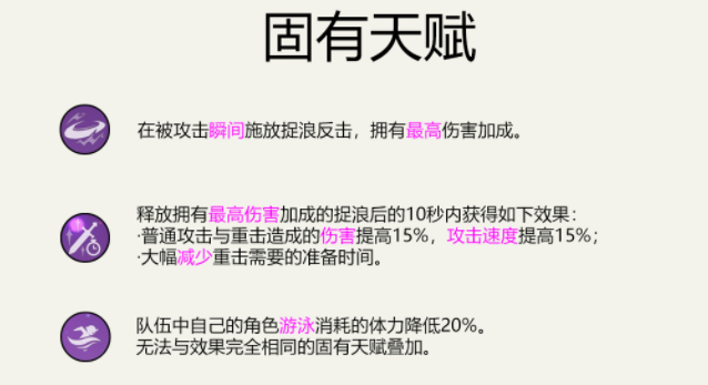 天赋一:被攻击的瞬间按元素战技可以造成最大伤害。
