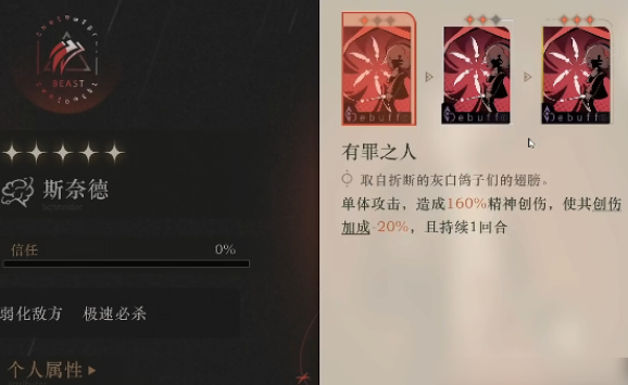 然后“有罪之人”同样是单体伤害技能,使用后会造成160%的单体伤害,之后还会降低敌人20%的创伤加成,这一削弱影响的是进攻端,它能够让目标敌人的伤害被严重削减,而且如果升满星后这个降低的幅度将提升到40%,另外持续时间也是长达两回合的,因此该技能给予了斯奈德应对高伤害敌人时的能力,另外这两个技能都是属于debuff技能,所以并不会受到“缴械”的影响。