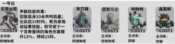 4、搭配:无常凶鹭(主词条-防御加成)、车刃镰(主词条-防御加成)、坚岩斗士(主词条-防御)、呼咻咻、晶螯蝎(主词条-防御)。