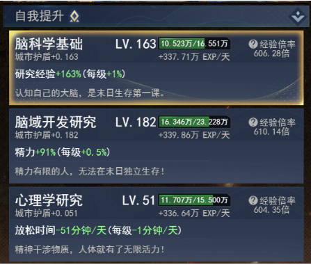 在前三个研究领域,其中自我提升中的脑科学和精神科学研究需要学习到2000级以上。神经科学研究只需要学到180级就足够了。然后我们下一步就是苟钱,苟钱前提就需要我们学习专业的技能知识。