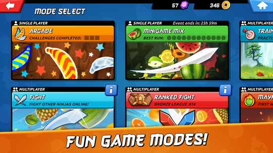 水果忍者2延续了前作的基本玩法,也加入了一些新的角色和道具,能丰富玩家的游戏体验。玩家可以解锁自己喜欢的角色去进行游戏,多种的游戏模式能带给玩家切水果的乐趣。目标是切掉更多的水果,拿到最高分数,成为真正的切水果大师。玩法休闲有趣,很适合在无聊的时光里打发时间,感兴趣的就来下载试试吧。