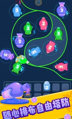 布控塔防,发射颜料炮弹,涂鸦式发射涂满整个屏幕,拦截所有想要进犯的泡泡怪兽