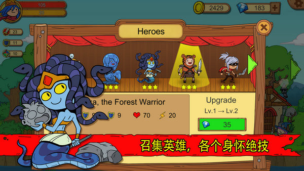 1.针对不同地图、不同的BOSS以及关卡,则选择不同的英雄才是王道,而且英雄还能升级,可大幅度提升各方面属性。