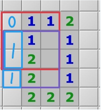 如上图所示,根据扫雷规则,可以很轻松的推出左侧雷的分布,可以这么理解,因为红色框的中间是1,所以红色框里左边三个格子只会有一个雷,同理,紫色框的左边会有两颗雷,而且分布在两个蓝色的框里。