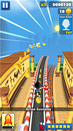 1.划屏控制方向。和所有跑酷游戏类似,玩家左右划屏控制游戏角色左右移动,上划跳跃,下划蹲曲,比较有意思的是主角在空中的时候也可以左右控制方向。