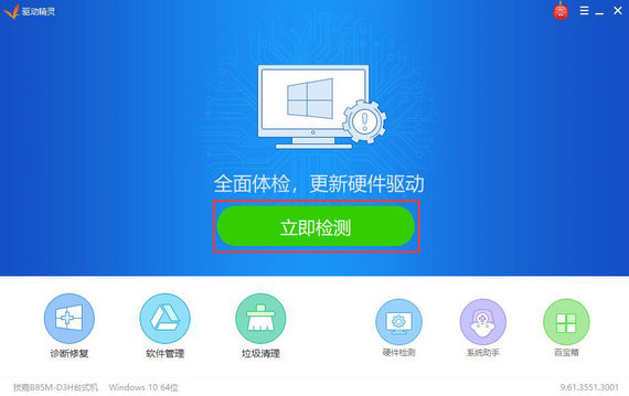 1、打开安装好的驱动精灵,点击主界面中间的“立即检测”按钮。