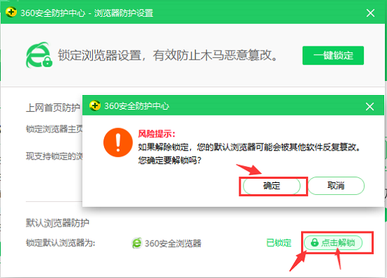 3、进入默认浏览器防护界面后,如下图所示,可以看到锁定的默认浏览器为360安全浏览器,如果想更换默认浏览器,那么选择右下角的“点击解锁”按钮,弹出风险提示框,用户点击确定后进行更改。