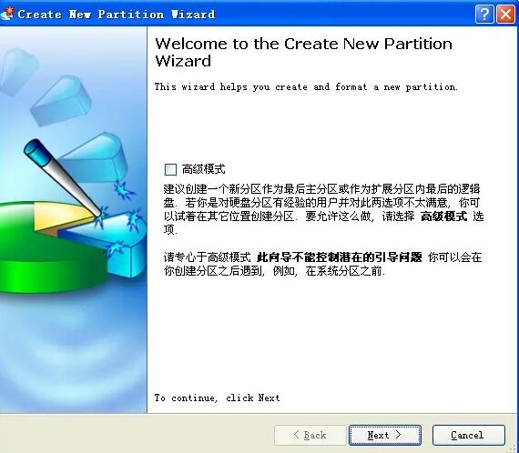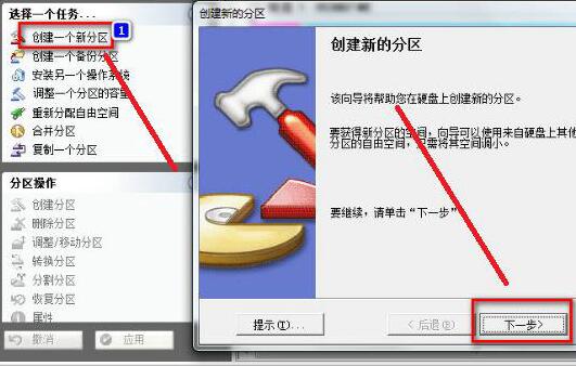 单击最左上角的“创建一个新分区”,打开“创建新分区”对话框,直接单击“下一步”按钮即可
